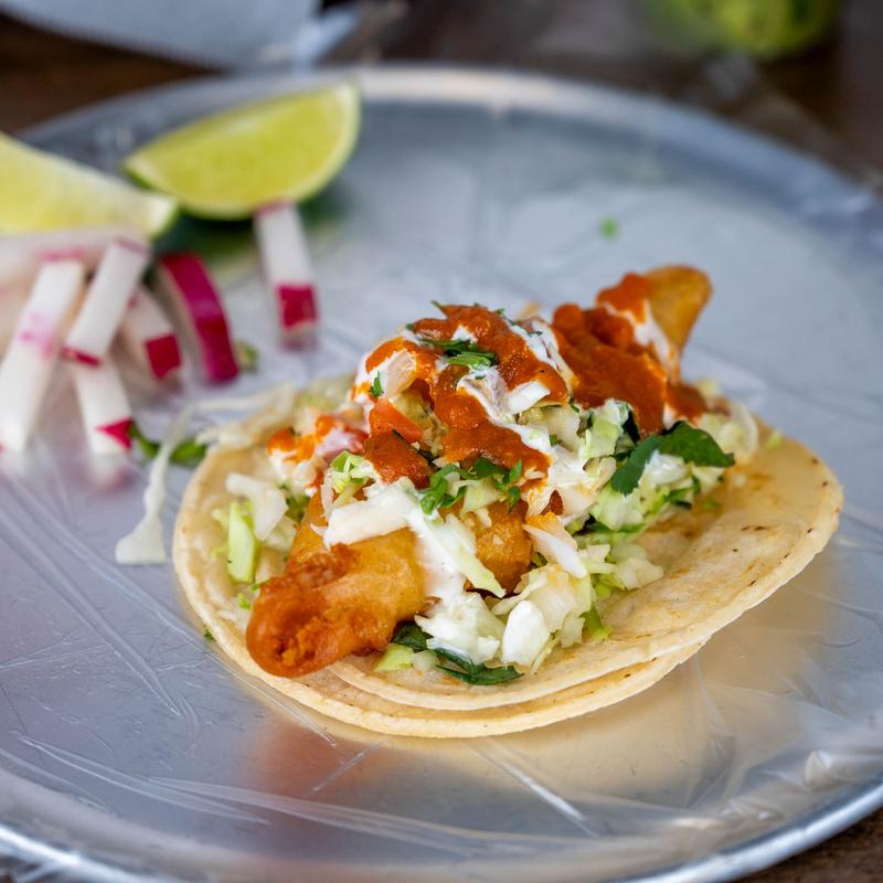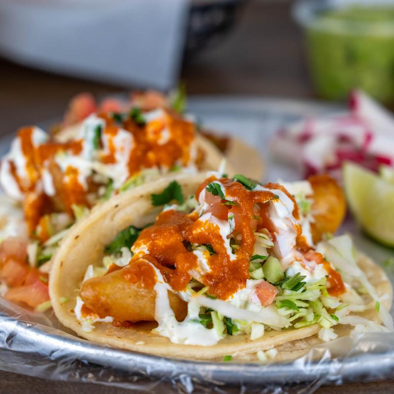 Fried fish, onions, cilantro, cabbage, tomato, cream, and salsa