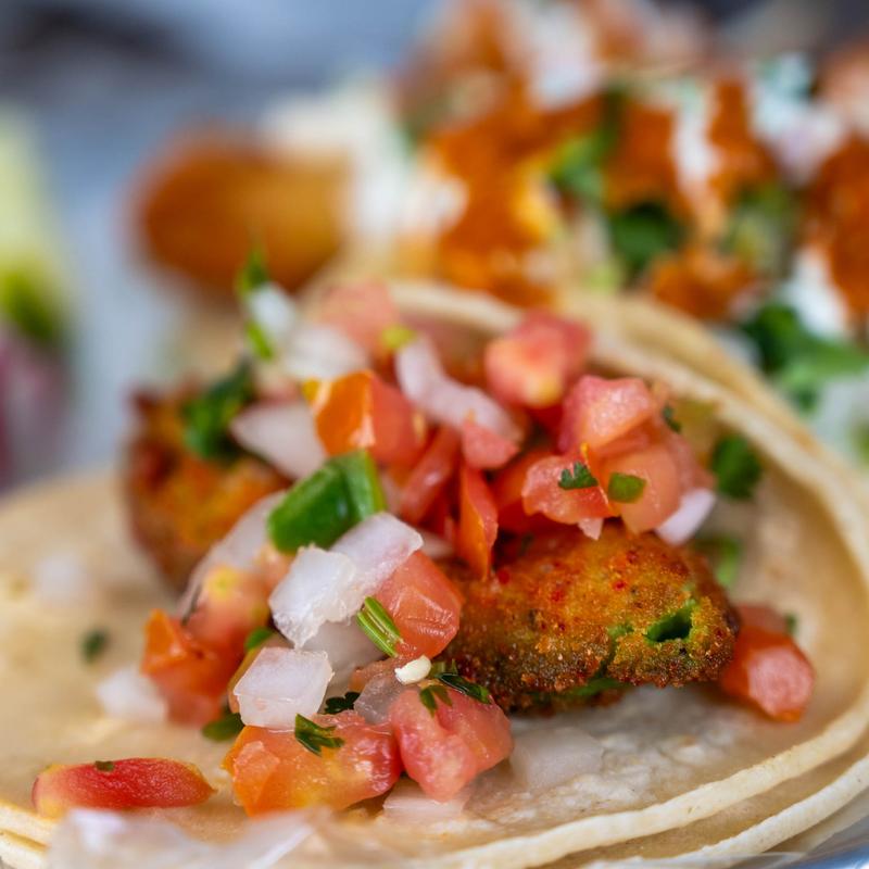 Fried shrimp, onions, cilantro, cabbage, tomato, cream, and salsa